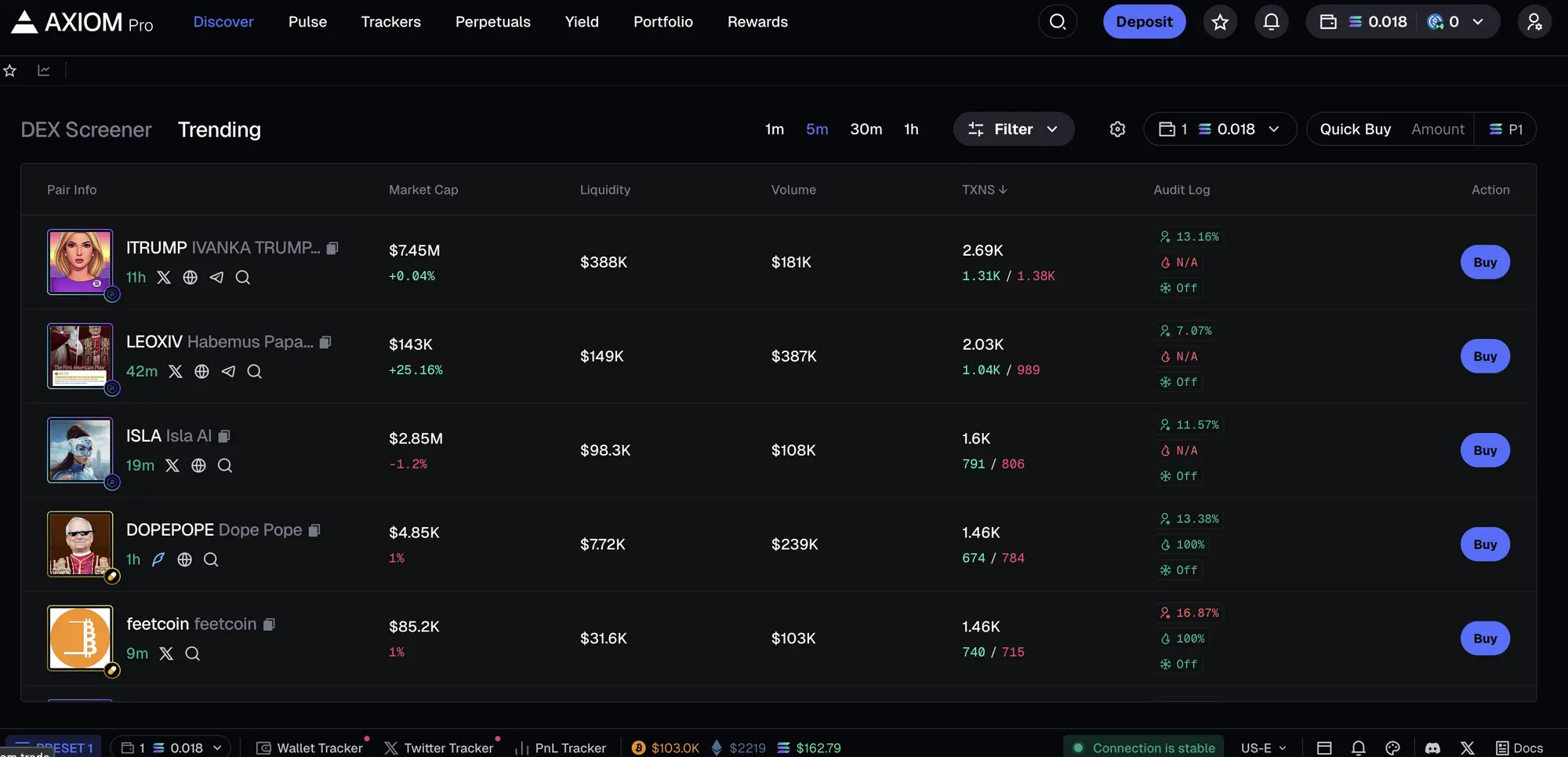 Axiom supports an extensive range of memecoins and enhances trading with rapid execution, seamless wallet integration, and powerful analytics tools such as: